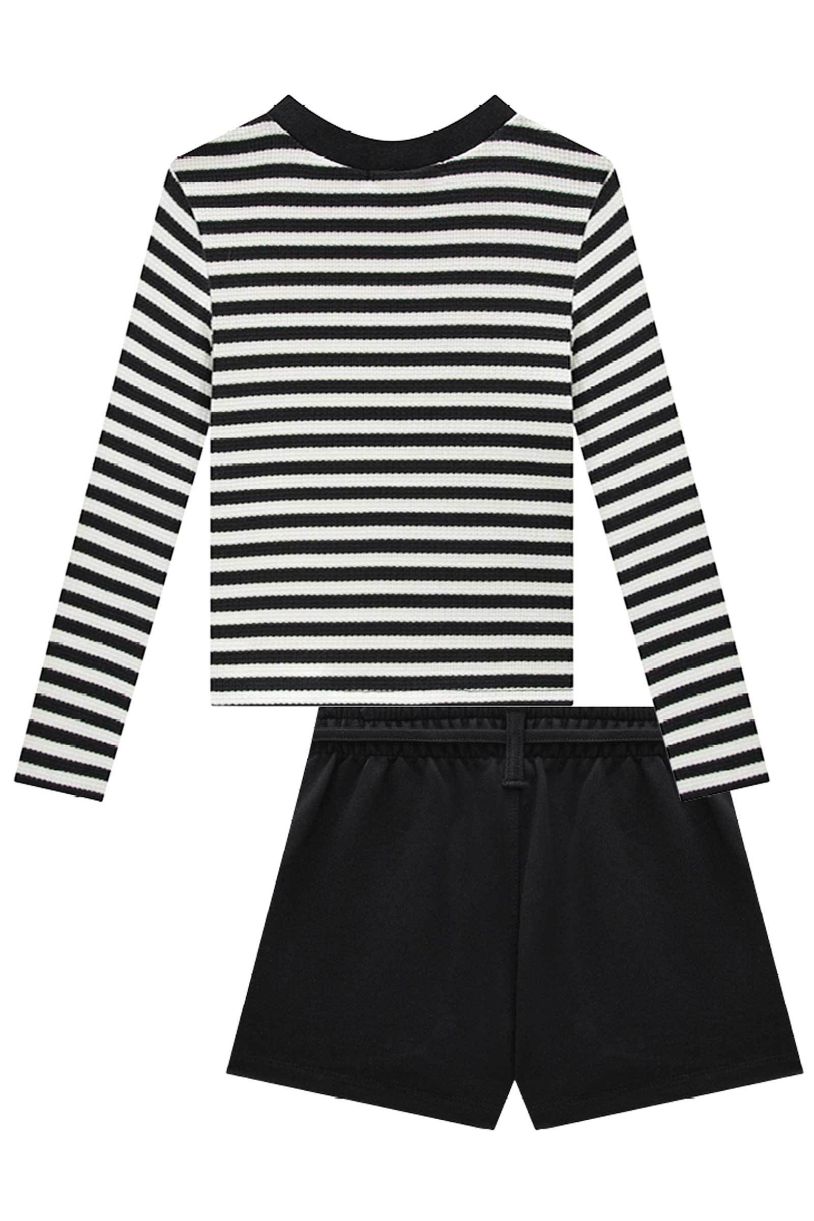 O conjunto de blusa em malha waffle listrada e shorts em moletom sem pelúcia, é a escolha perfeita para as meninas que amam um look cheio de conforto, sem abrir mão do estilo no dia à dia! Disponível em uma cor super estilosa - preto - ela é uma peça essencial, perfeita para montar diversos looks e deixar o inverno das pequenas ainda mais estiloso!