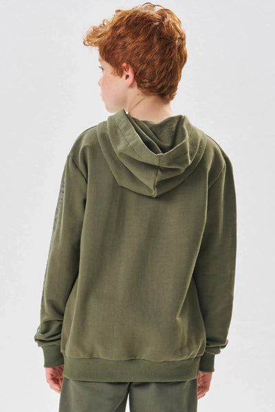 Clássico blusão com capuz confeccionado em moletom sem pelúcia. Possui detalhe de bolso frontal com lapela e bolso canguru em nylon. Estampa de escrita nas mangas.
