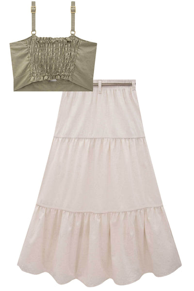 O conjunto de top cropped e saia mii em linho deluxe é perfeito para quem busca conforto, leveza e muito estilo. Disponível em uma cor super estilosa - verde - este conjunto é a escolha ideal para os dias de mais quentes.