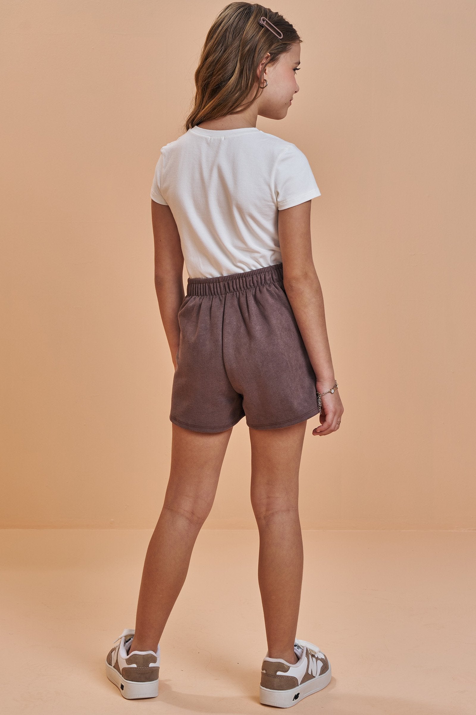Composto por blusa boxy em meia malha off-white e shorts em suede twill marrom, o look traz uma proposta moderna, elegante e superconfortável.