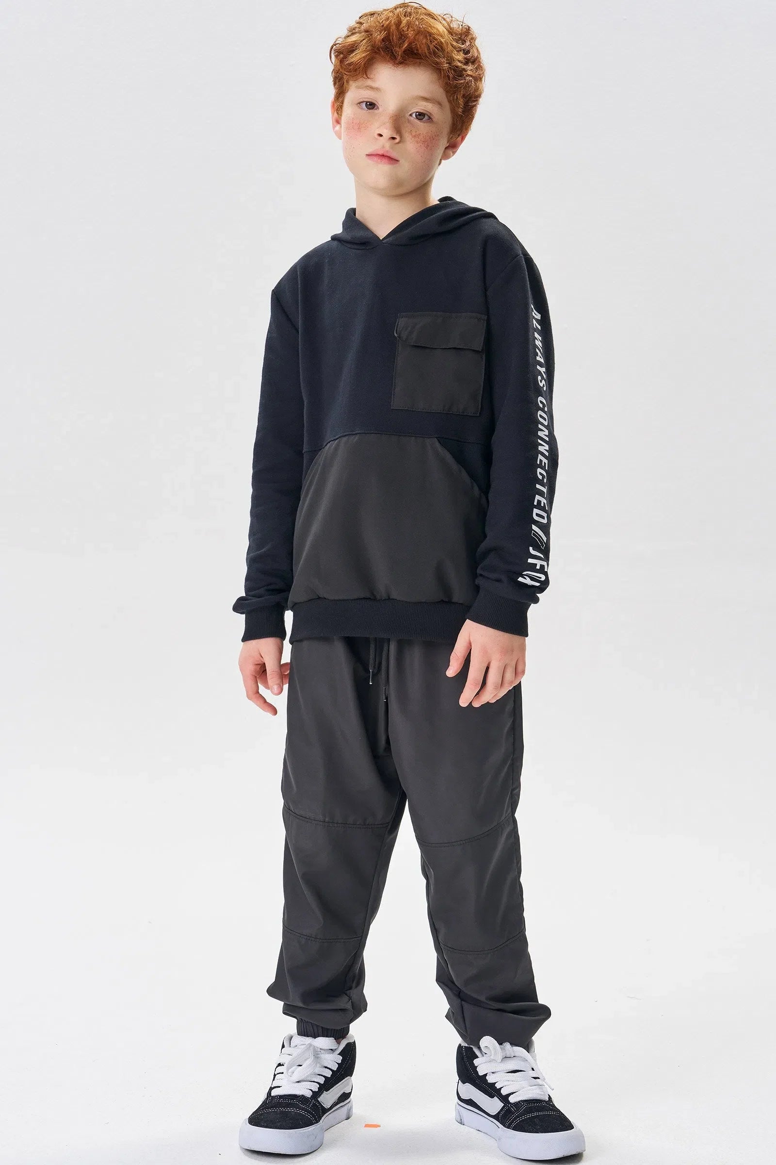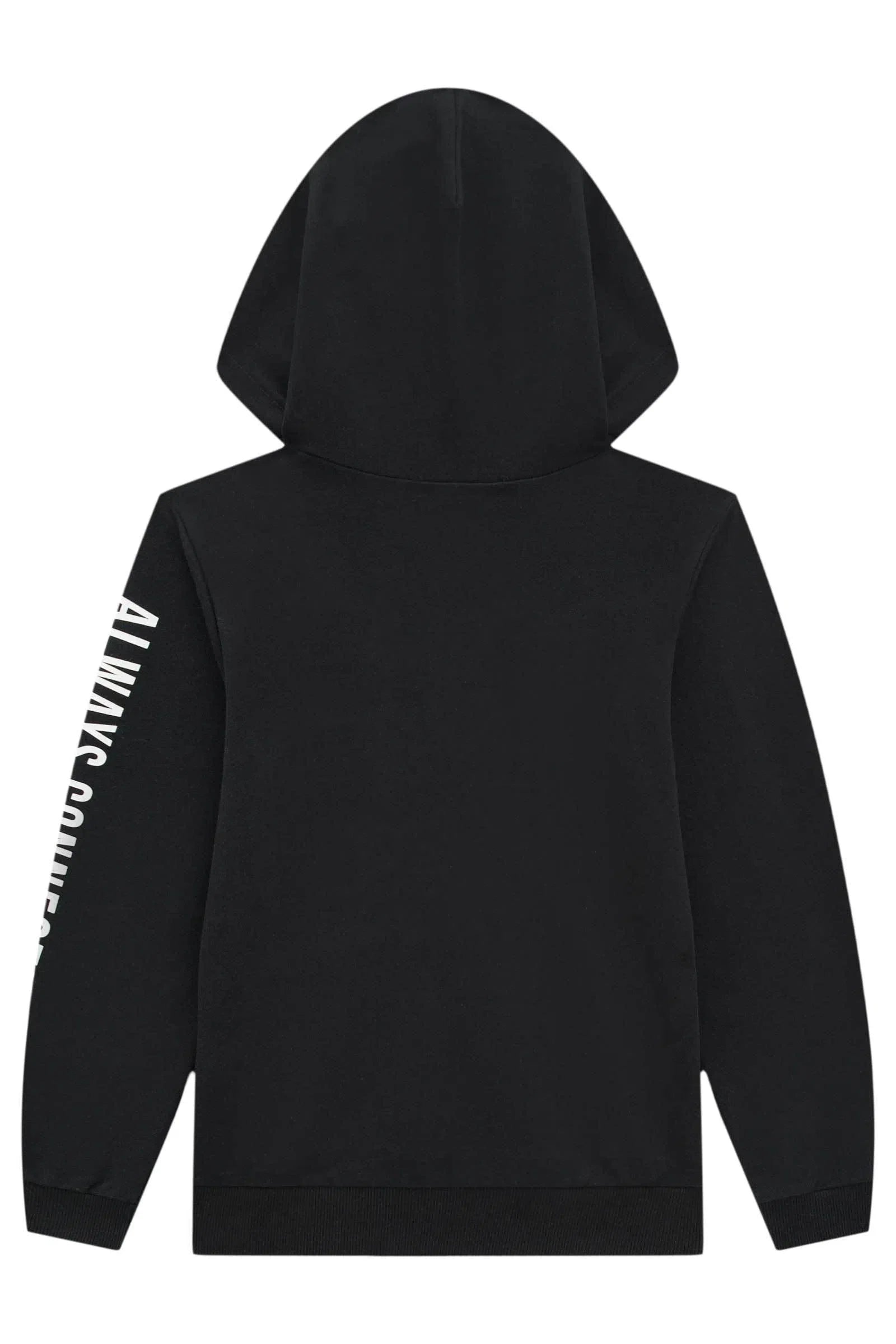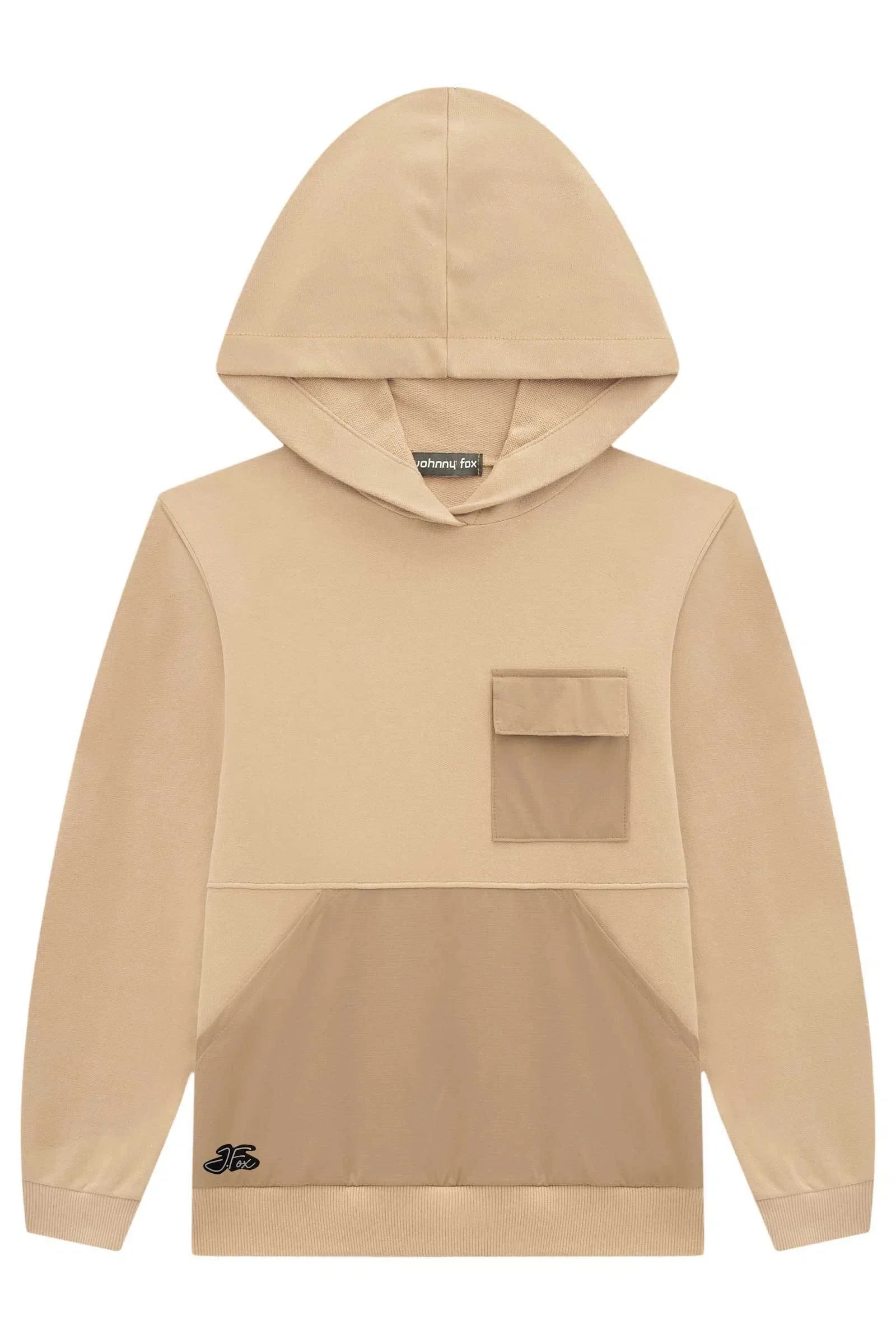 Clássico blusão com capuz confeccionado em moletom sem pelúcia. Possui detalhe de bolso frontal com lapela e bolso canguru em nylon. Estampa de escrita nas mangas.