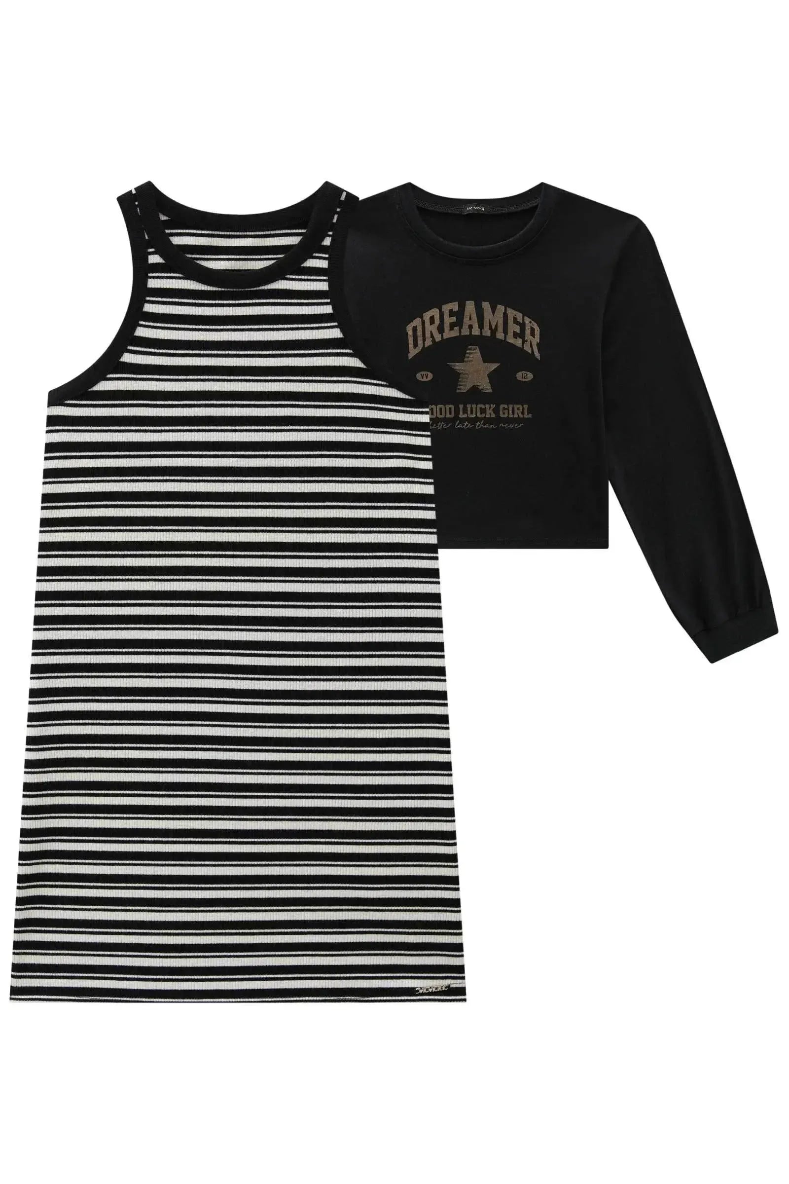 Vestido em Canelado Luna de Viscose e Blusa Boxy Over Sobreposição em Meia Malha 89199 Vic&Vicky Teen Menina